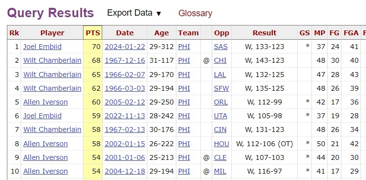Theo thống kê, 54 điểm của Maxey trong trận đấu này đứng thứ chín trong danh sách ghi điểm trong một trận đấu của 76ers. Chỉ Embiid, Chamberlain và Iverson là ghi nhiều bàn hơn anh ấy.
