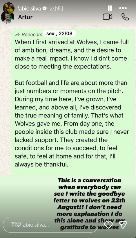 Fabio Silva đã viết: Mọi người có thể thấy rằng đây là một cuộc trò chuyện khi tôi viết thư chia tay cho Wolves vào ngày 22 tháng 8. Tôi bày tỏ lòng biết ơn của mình với những con sói thông qua lời nói.