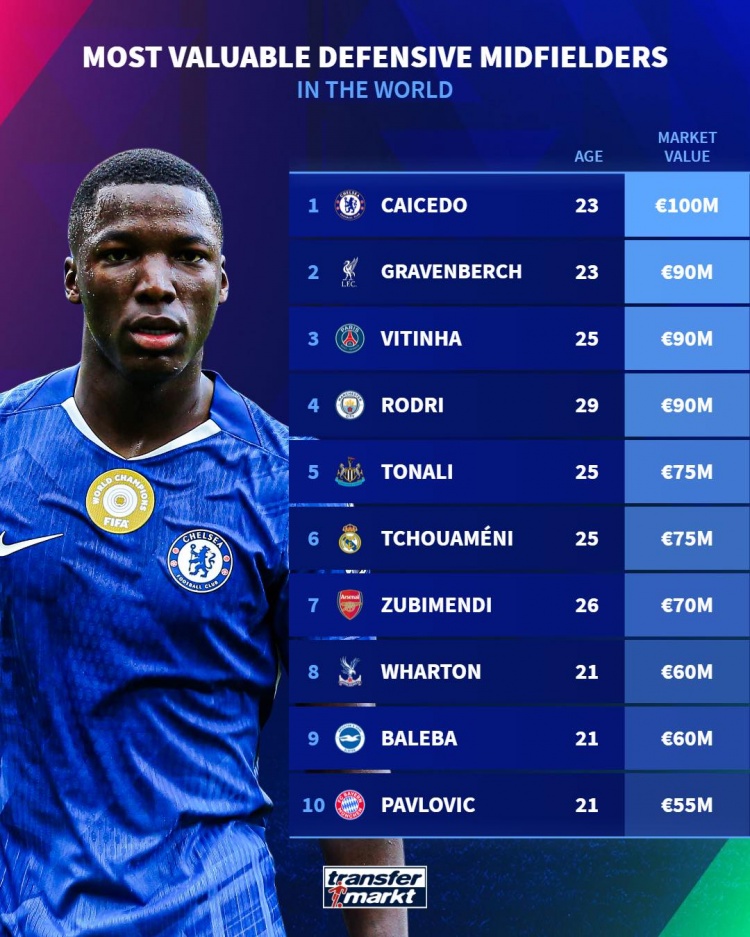 Thị trường chuyển nhượng Đức liệt kê bảng xếp hạng giá trị của các tiền vệ phòng ngự, trong đó Caicedo đứng đầu với 100 triệu euro.