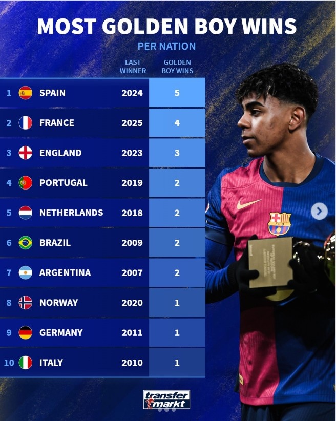 Cầu thủ trẻ Douay của Paris Saint-Germain đã giành được Giải thưởng Cậu bé vàng năm 2025. Dezhuan đếm số lần các cầu thủ đến từ các quốc gia khác nhau giành được giải Cậu bé vàng, trong đó Tây Ban Nha đứng đầu với 5 lần.