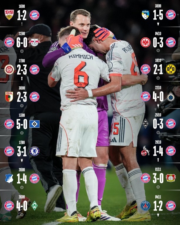 Ở vòng đấu Champions League này, Bayern đã đánh bại Paris 2-1 và giành được 16 chiến thắng liên tiếp. Bayern chính thức tung poster chuỗi 16 trận toàn thắng. Chuỗi 16 trận không thắng của Bayern cũng tiếp tục lập kỷ lục khởi đầu tốt nhất ở 5 giải đấu lớn. Họ cũng sẽ đối đầu với Union Berlin, Freiburg, Arsenal và St. Pauli trong tháng này. {3 đối tượng Frankfurt