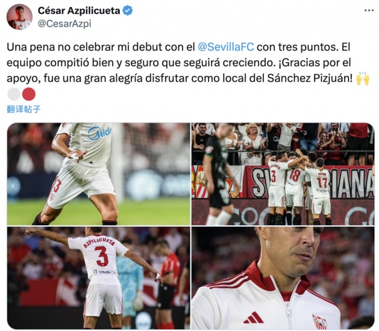 Trong vòng thứ tư của La Liga, Sevilla đã vẽ 2-2 với Elche tại nhà. Cựu chiến binh Azpilicueta bắt đầu trò chơi và hoàn thành lần xuất hiện đầu tiên sau khi tham gia trò chơi. Các cầu thủ đã cập nhật trên phương tiện truyền thông xã hội sau trò chơi.